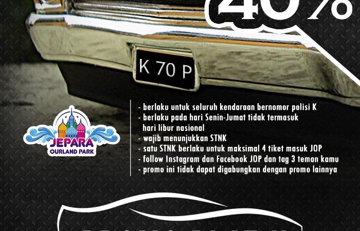 Untuk mengapresiasi warga Eks-Karesidenan Pati, Jepara Ourland Park, sebuah wahana wisata air terbesar yang berada di Kabupaten Jepara yang dahulu bagian dari Eks-Karesidenan Pati, memberikan DISKON 40% bagi pemilik kendaraan dengan nomor polisi K. Syarat dan ketentuan berlaku. Untuk keterangan lebih lanjut, silakan hubungi kontak 0291- 4260388 (09:00 – 17:00 WIB) atau WhatsApp 081225566655.